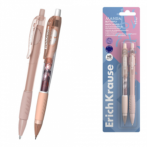 Набор из ручки шариковой автоматической Matic&Grip 0.7, цвет чернил синий и карандаша мех 0.7, HB ErichKrause Butterfly Manga (в блистере) |