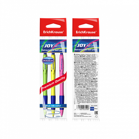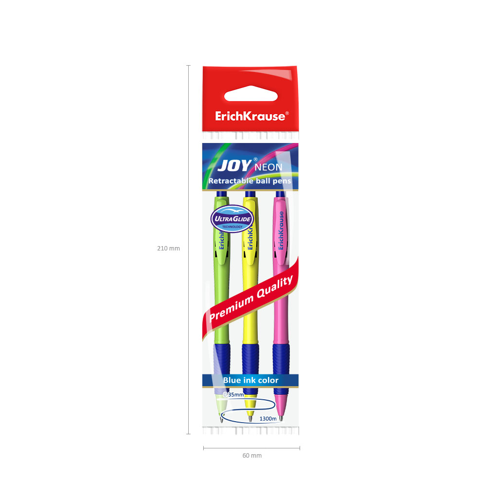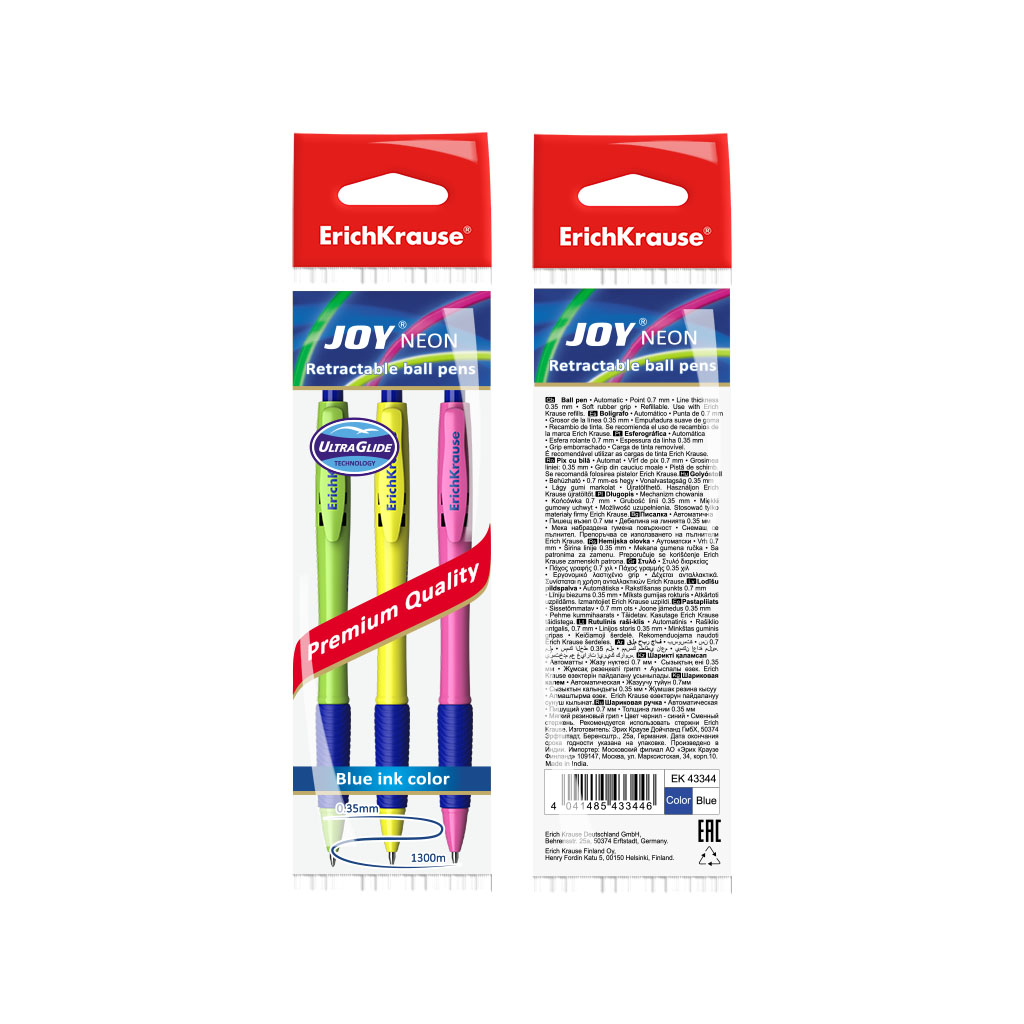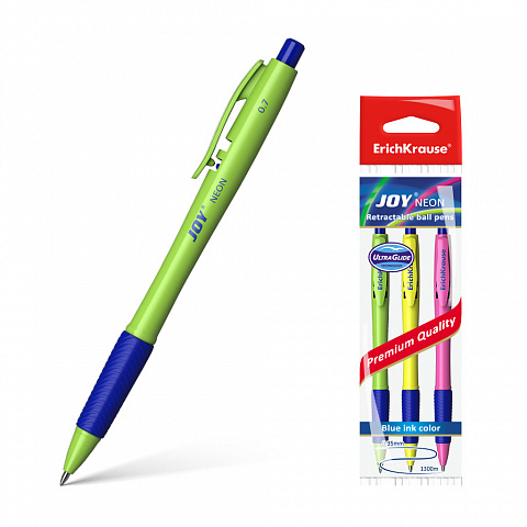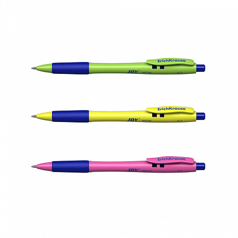 Набор из 3 ручек шариковых автоматических ErichKrause JOY® Matic&Grip Neon 0.7, Super Glide Technology, цвет чернил синий (в пакете) |