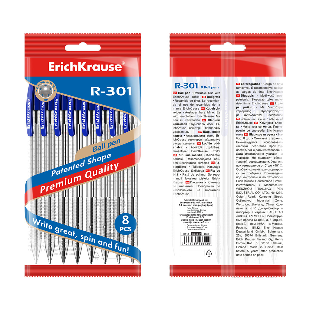 Набор из 8 ручек шариковых автоматических ErichKrause R-301 Matic Classic 1.0, цвет чернил синий (в пакете)