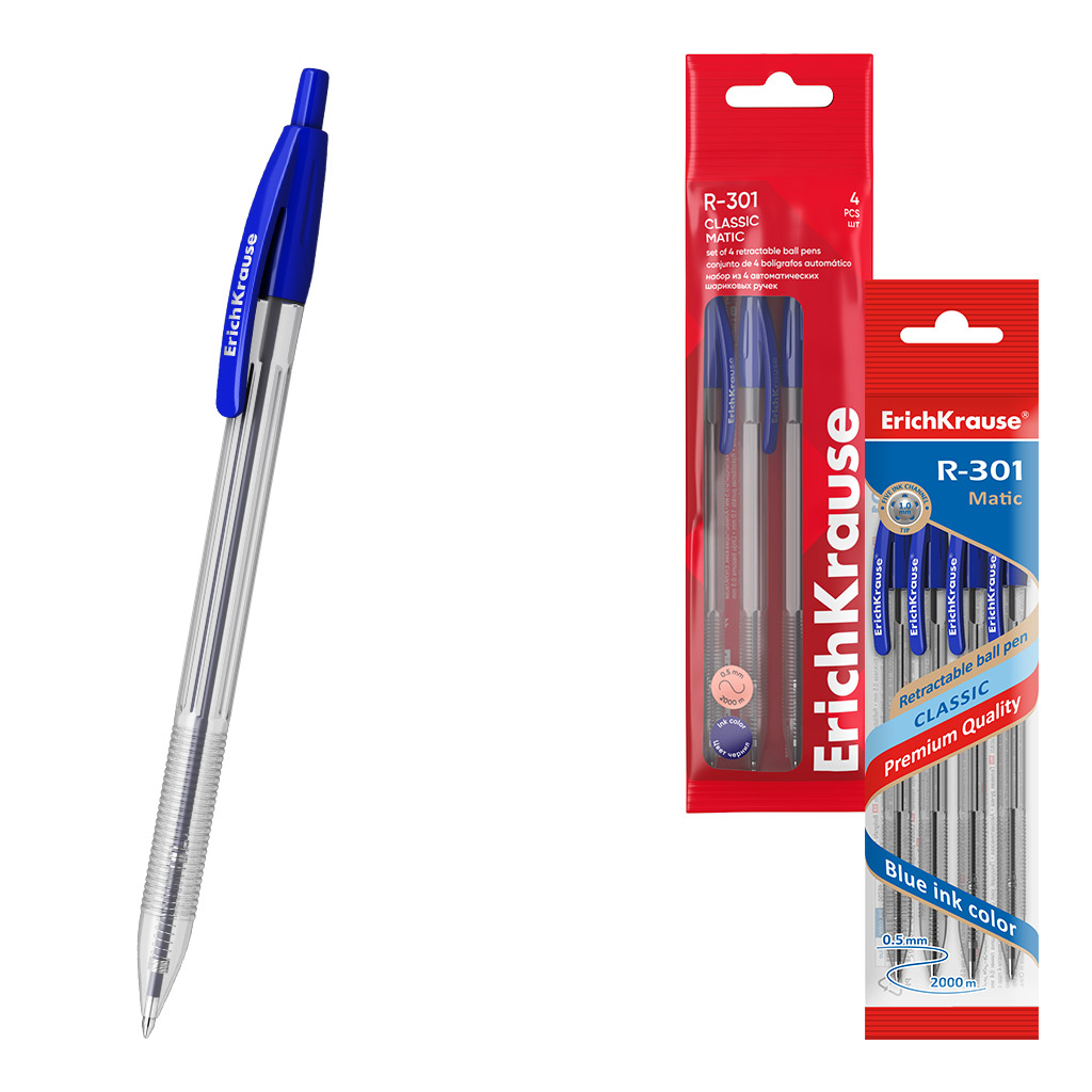 Набор из 4 ручек шариковых автоматических ErichKrause R-301 Matic Classic 1.0, цвет чернил синий (в пакете) |