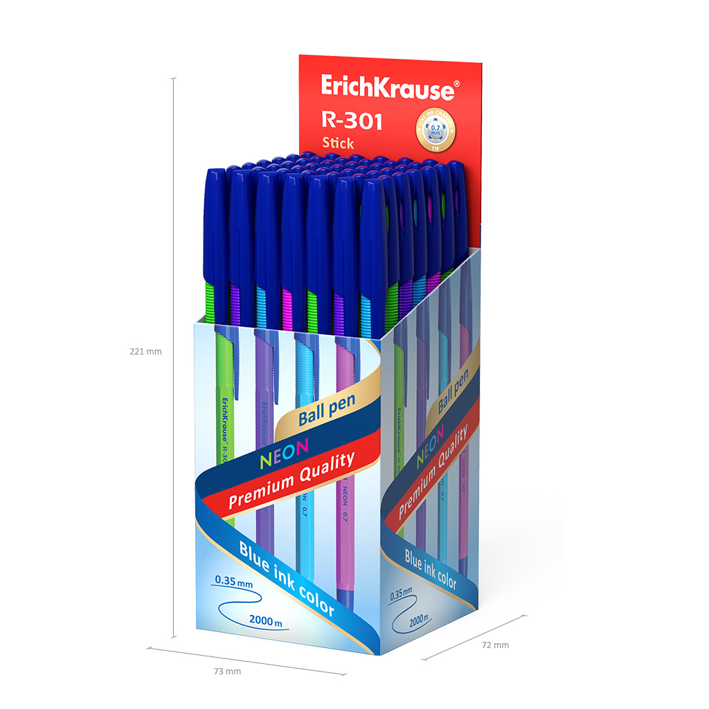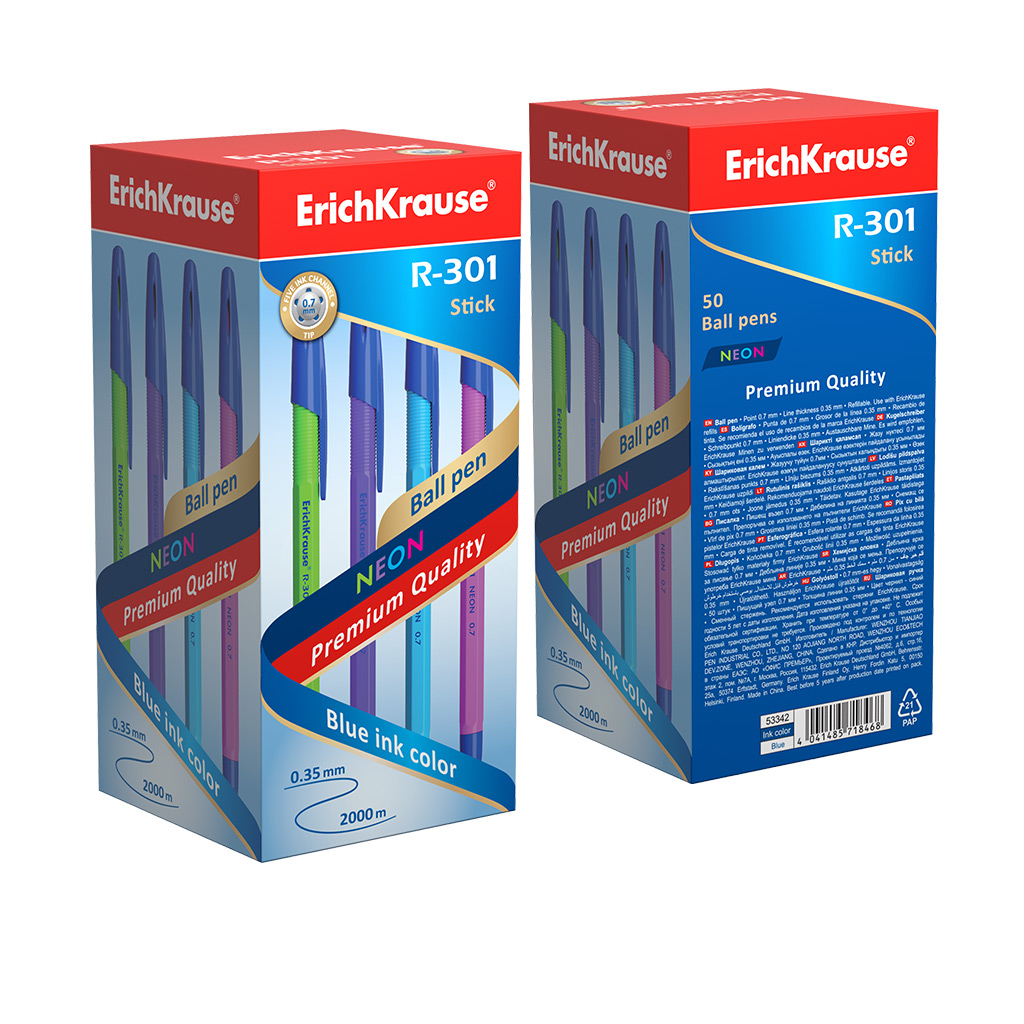 Классическая автоматическая шариковая ручка Matic со стандартным типом пишущего узла и заменяемым стержнем. Ручка имеет непрозрачный шестигранный корпус ярких неоновых цветов с удобной профилированной грип-зоной. Цвет клипа соответствует цвету чернил. 5-канальный пишущий узел с диаметром шарика 1.0 мм в сочетании с быстросохнущими чернилами обеспечивает мягкое и комфортное письмо. Длина непрерывной линии составляет 2000 м при толщине 0.5 мм. Ручки серии R-301 имеют узнаваемую запатентованную форму и стали бестселлерами в ассортименте шариковых ручек Erich Krause более чем в 50 странах мира. |
