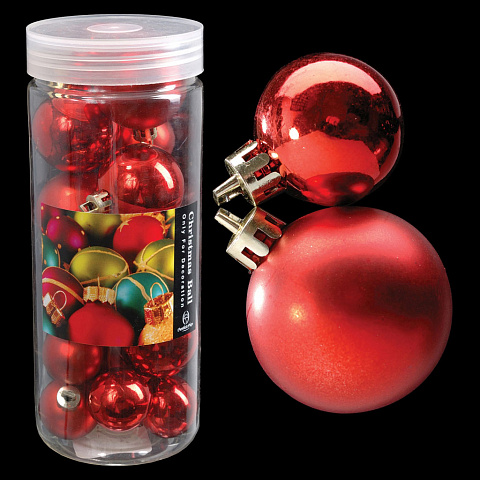 В набор входит 16 матовых и глянцевых шаров красного цвета, выполненных из пластика: 8 штук - диаметр 3.5 см; 8 штук - 2.5 см. Упаковка - тубус из ПВХ с отвинчивающейся крышкой. |