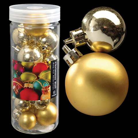 В набор входит 16 матовых и глянцевых шаров золотого цвета, выполненных из пластика: 8 штук - диаметр 3.5 см; 8 штук - 2.5 см. Упаковка - тубус из ПВХ с отвинчивающейся крышкой. |