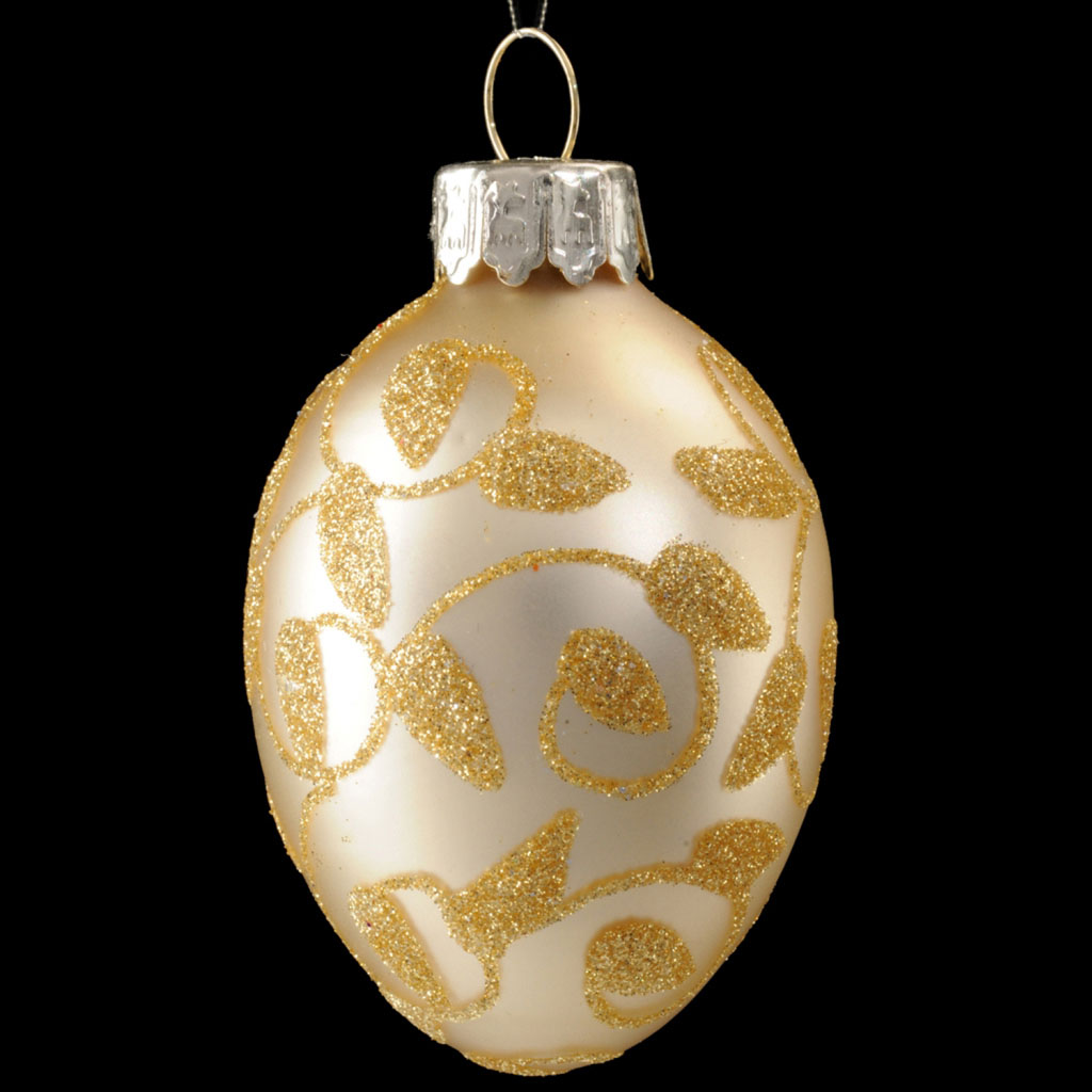 Набор состоит из шести украшений цвета жемчуга, выполненных из стекла и декорированных золотыми листьями. Упаковка - коробка из ПВХ, украшения внутри зафиксированы. |