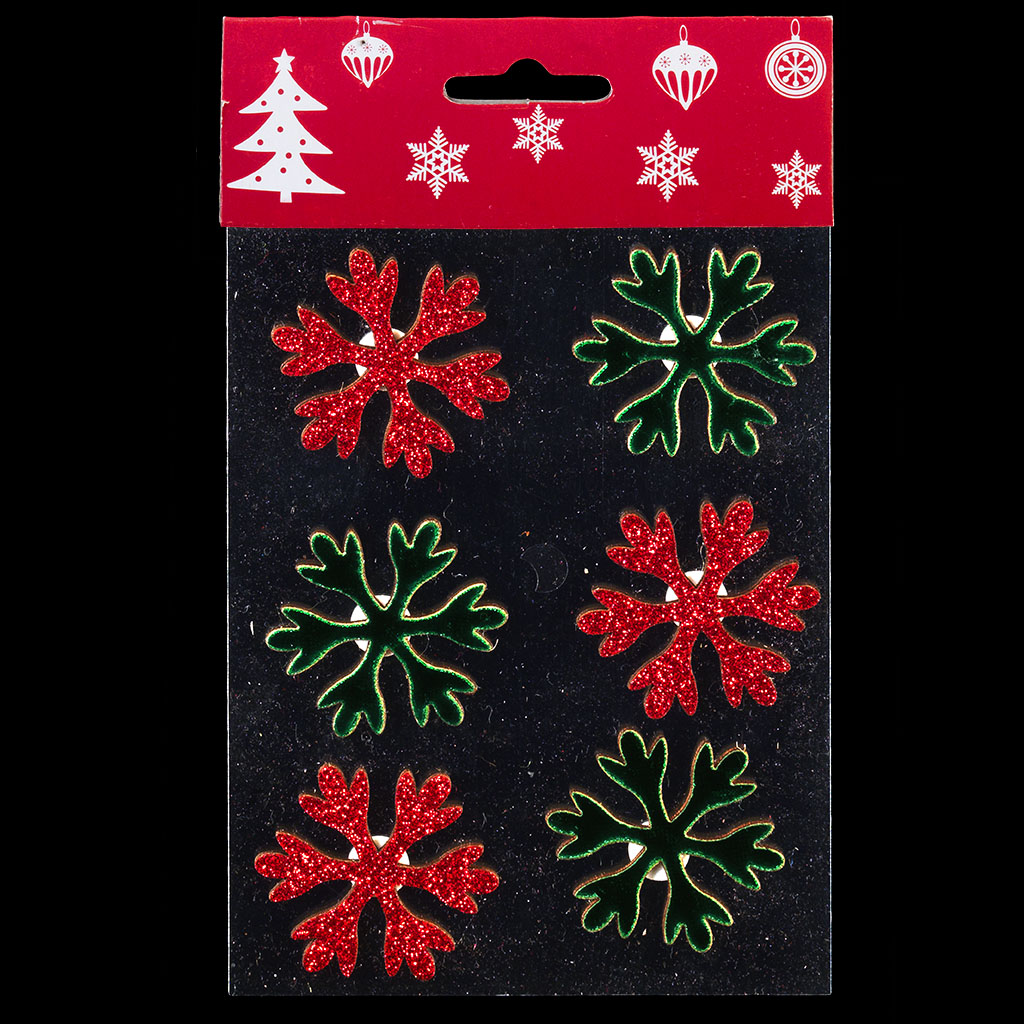 Набор состоит из шести снежинок яркого зеленого и красного цветов. Благодаря наличию клеевого фрагмента в форме окружности с тыльной стороны, изделия легко отлепляются от прозрачной подложки. Набор предназначен для творческих работ ребенка. С его помощью можно легко украсить открытки, подарки, а также оформить детский уголок, привнеся в него новогоднюю атмосферу. Снежинки покрыты сверкающими блестками. Упаковка: хедер с европодвесом, подложка в полибеге. |