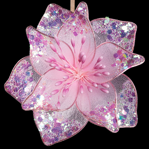 Изящный цветок, декорированный голографическими стразами. При помощи прочного клипа цветок крепится на еловые ветки, шторы и прочие детали интерьера. Техническая упаковка - полибэг, только для безопасной транспортировки и хранения. |