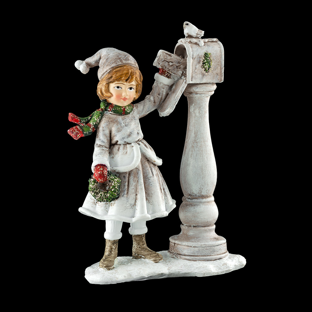 Дети в ретро-стиле пользуются широкой популярностью. Фигурка девочки, отправляющей праздничные послания, выполнена в пастельных тонах и контрастирует с деталями зеленого и красного цвета. Детали сувенира тонко прорисованы. Групповая упаковка предназначена только для безопасной транспортировки и хранения. |