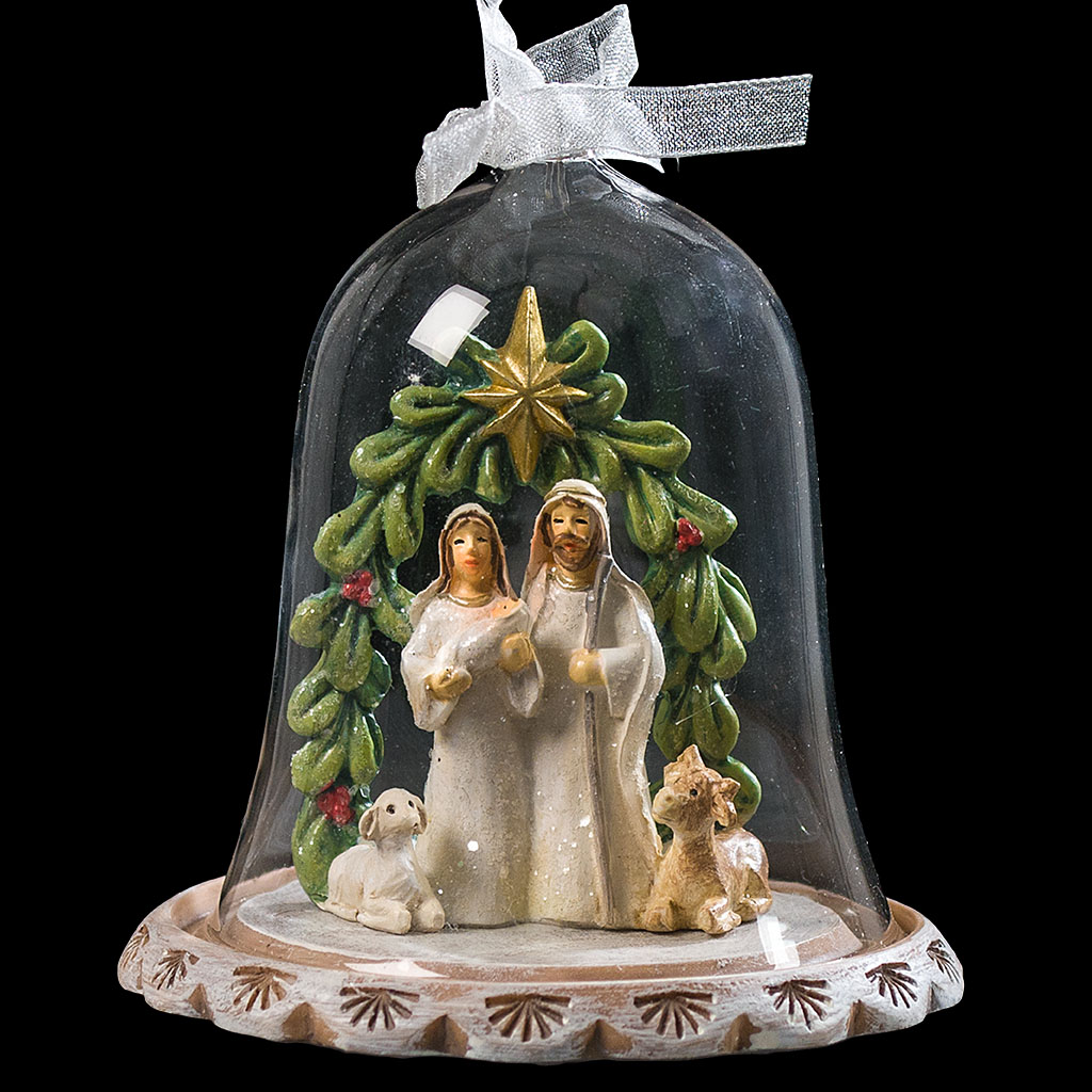 Изысканное новогоднее украшение представляет собой стеклянный купол на подставке. Внутри расположена композиция, созданная по мотивам библейской истории о рождении Христа. Изделие очень деликатно выполнено, потому его равноценно можно использовать как украшение праздничного стола или для подвешивания на елку за изящный бантик. Групповая упаковка предназначена только для безопасной транспортировки и хранения изделий. |