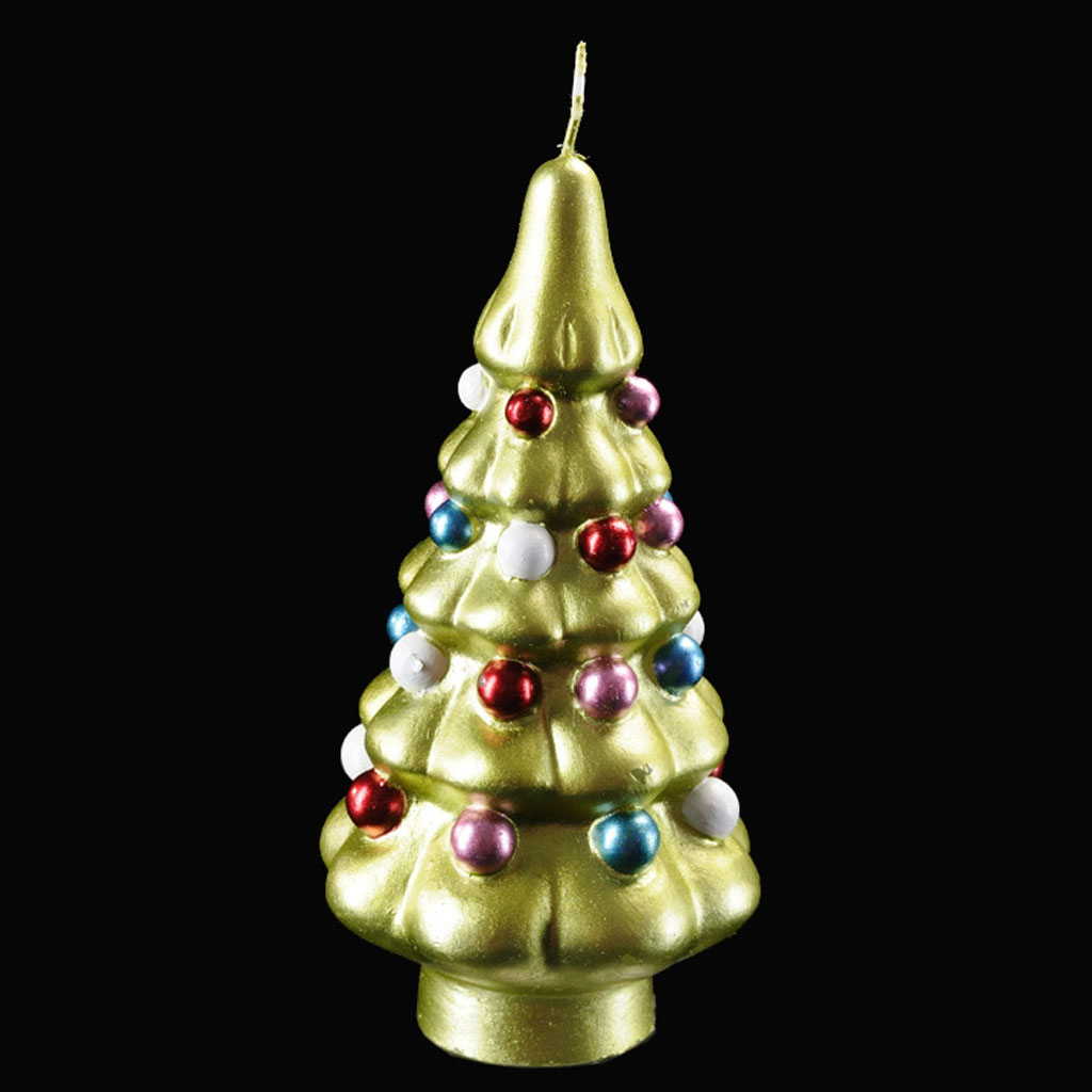 Декоративная свеча-конус выполнена в виде елки, украшенной цветными шарами. Упаковка - полибэг с подарочной ленточкой. |