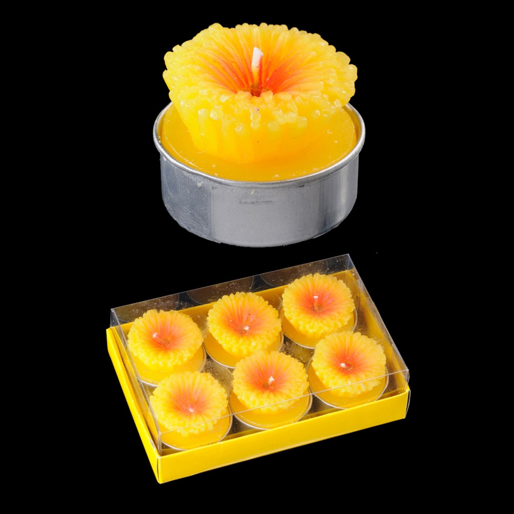 Набор состоит из шести свечей-картриджей, каждая из которых имеет объемную форму желтого цветка маргаритки. Упаковка - картонная коробка с ПВХ-крышкой. |