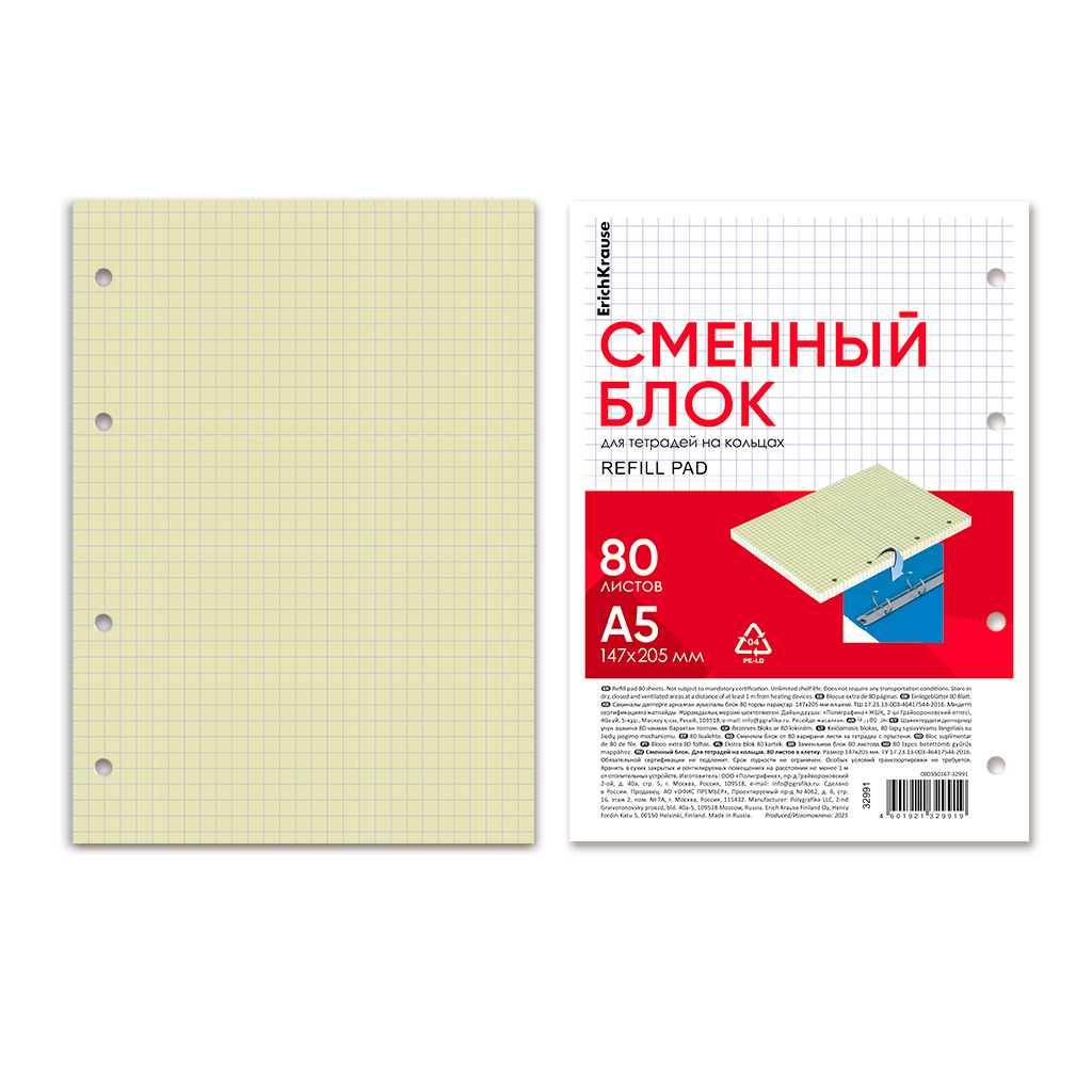 Сменный блок для тетрадей на кольцах формата А5 (147х205 мм). Благодаря плотной верхней обложке блок не деформируется. 80 листов в клетку. Бумага офсетная тонированная плотностью 60 г/м2. Цвет линовки - синий. Перфорация под кольца. Имеет индивидуальную упаковку в термоусадочную пленку. |