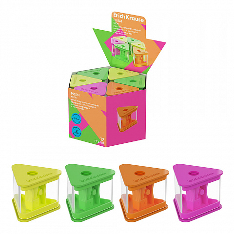 Точилка пластиковая ErichKrause Prism, Neon, с контейнером, ассорти (в коробке-дисплее по 12 шт)