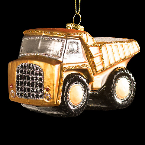 Праздничную елку могут украшать не только шары и сосульки, но и оригинальные украшения разных форм. Золотой грузовик, сделанный из качественного стекла, смотрится очень натуралистично. Колеса и спинка изделия декорированы блестками. Упаковка - слой плотной бумаги… |