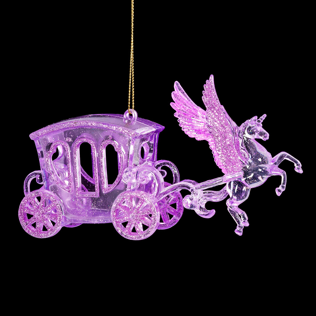 Карета с Пегасом выполнена в приятном оттенке сирени и частично покрыта блестками. Украшение имеет прозрачную основу. Упаковка - полибэг. |
