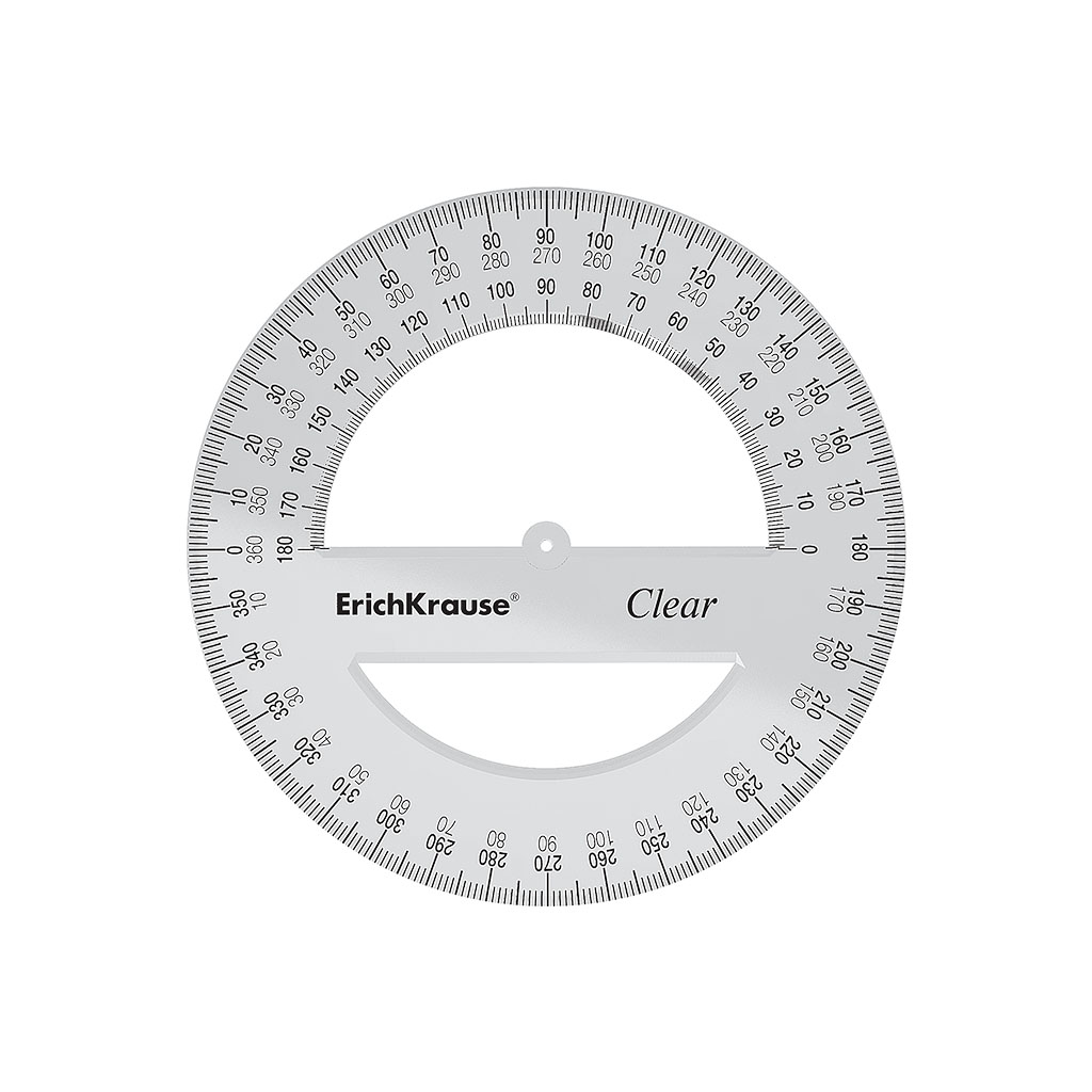 Транспортир из высококачественного прозрачного пластика. Точная угловая шкала 360°; длина разметки основания составляет 12 см. |