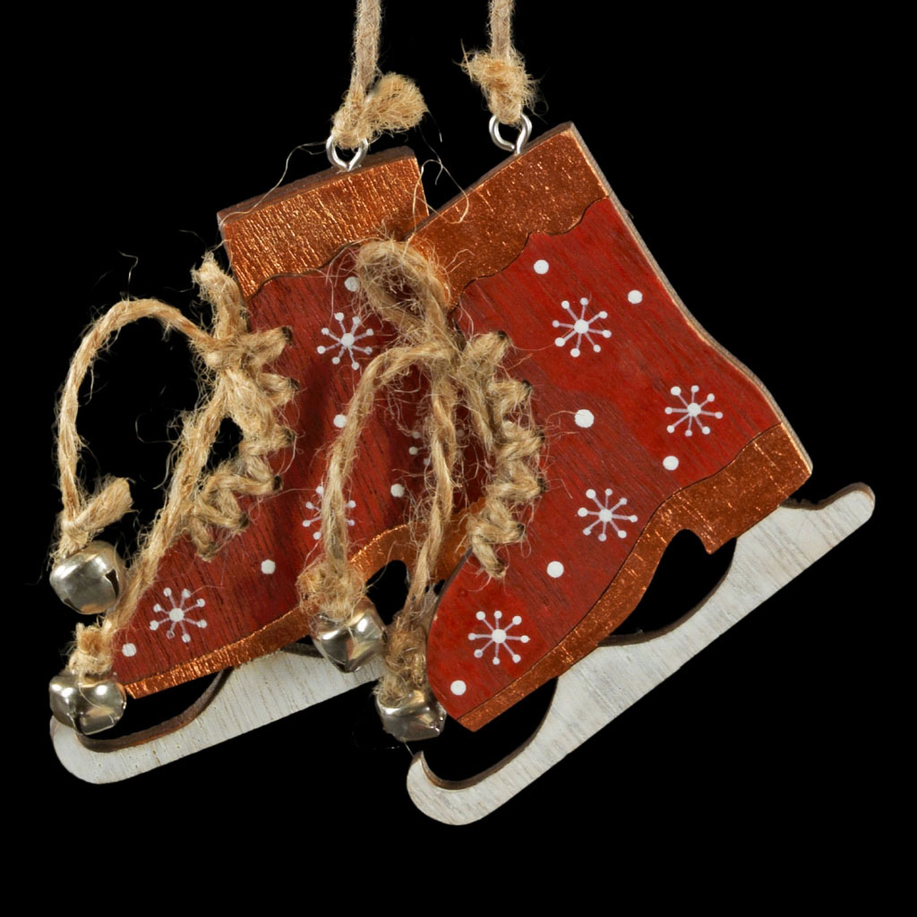 Украшения из древесины - тренд в области праздничного декора. Легкие и безопасные в использовании, на елке они смотрятся очень необычно. Пара коньков красного цвета соединены тонкой веревкой. Каждый конек декорирован бубенчикамими. Упаковка предназначена только для безопасной транспортировки и хранения. |