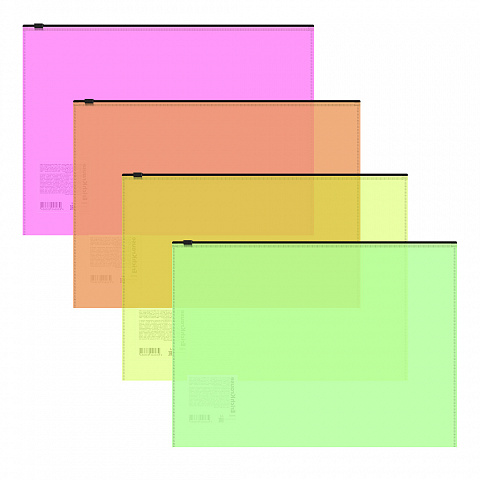 ZIP-пакет формата А4 из высококачественного полупрозрачного пластика с текстурой поверхности "апельсиновая корка", на которой не видно отпечатков пальцев и мелких царапин . Предназначен для хранения и транспортировки небольшого количества документов. Цвет ZIP-пакета – ассорти: желтый, зеленый, оранжевый, розовый. Удобная ZIP-молния обеспечивает быстрый доступ к бумагам. ZIP-пакет вмещает до 100 бумажных листов. Размер ZIP-пакета - 334х246мм, толщина материала - 0.14мм. Поставляется в различных вариантах цвета/дизайна без возможности выбора. Код и баркод на каждой единице товара. |