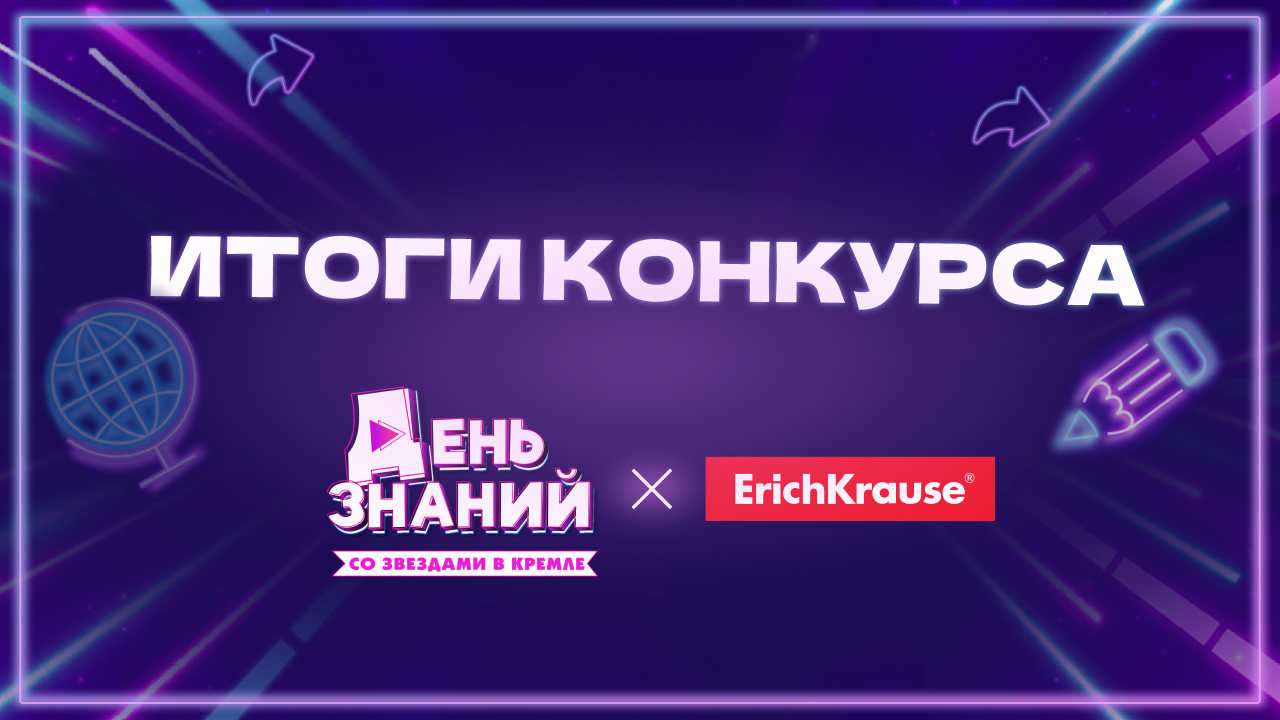 Сегодня завершился конкурс «День знаний со звёздами в Кремле», который проводился в социальной сети VK в преддверии 1 сентября — начала нового учебного года. Конкурс стал коллаборацией компании Erich Krause и праздничного концерта «День знаний со звёздами в Кремле». Победителей — Елену Смирнову, Михаила Юрьевича, Анастасию Жигареву, Павла Рогачева, Ольгу Крюкову объявили в прямом эфире на странице ErichKrause в VK.