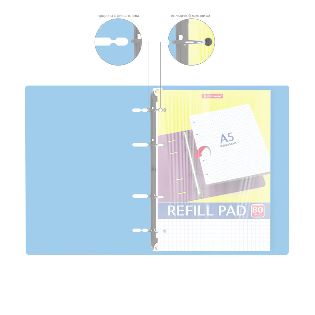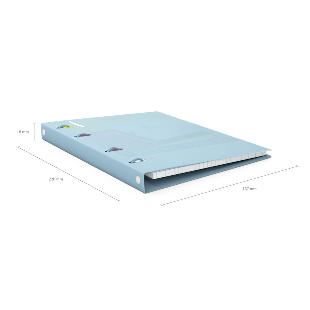 Notebook with size A5 (147x205 mm). Strong and durable matt polypropylene cover with texture «sand». 80 sheets per pad of quality paper 60 gsm. Paper ruling — dark blue squared. Cover has rounded corners for comfort and safety. Binding type — ring binders. Slots with lock for prevent unexpected notebook disclosure. |