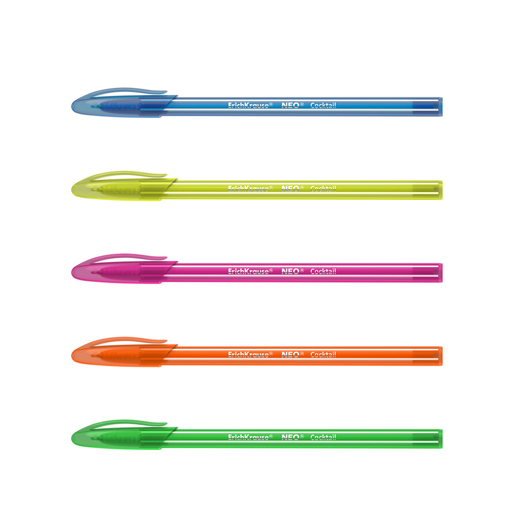 A bright disposable Stick ballpoint pen with a thinned needle tip type. The pen has a frosted translucent round barrel, reminding multicolor cocktail tubes and cap. The five-channel tip with the 0.7 mm ball diameter in combination with the low viscosity ink provides easy, accurate and quick writing.The continuous line length is 1000 m at the width of 0.26 mm, which is a high rate in its category. The model Neo® Stick Cocktail 0.7 has an elegant shape and became one of the bestselling items in the ErichKrause slim ballpoint pen product line-up in more than fifty countries worldwide. |