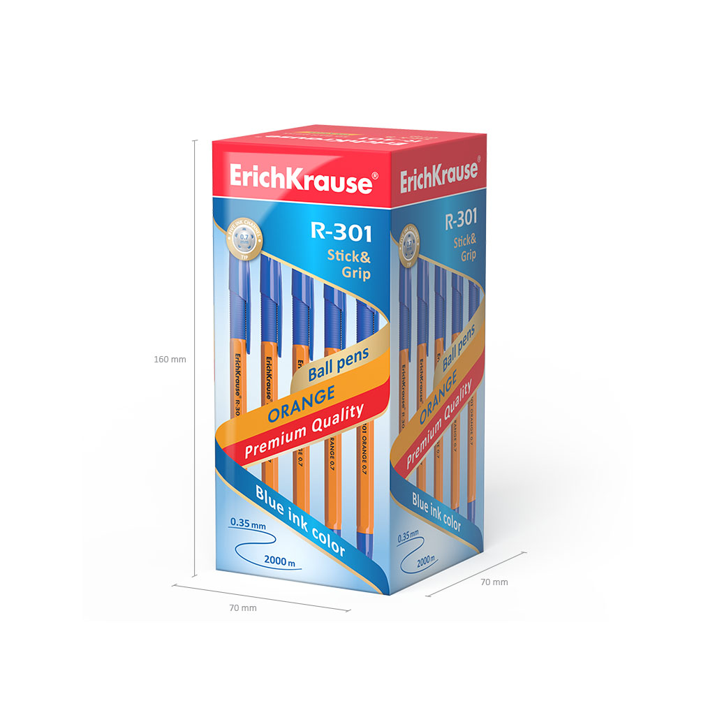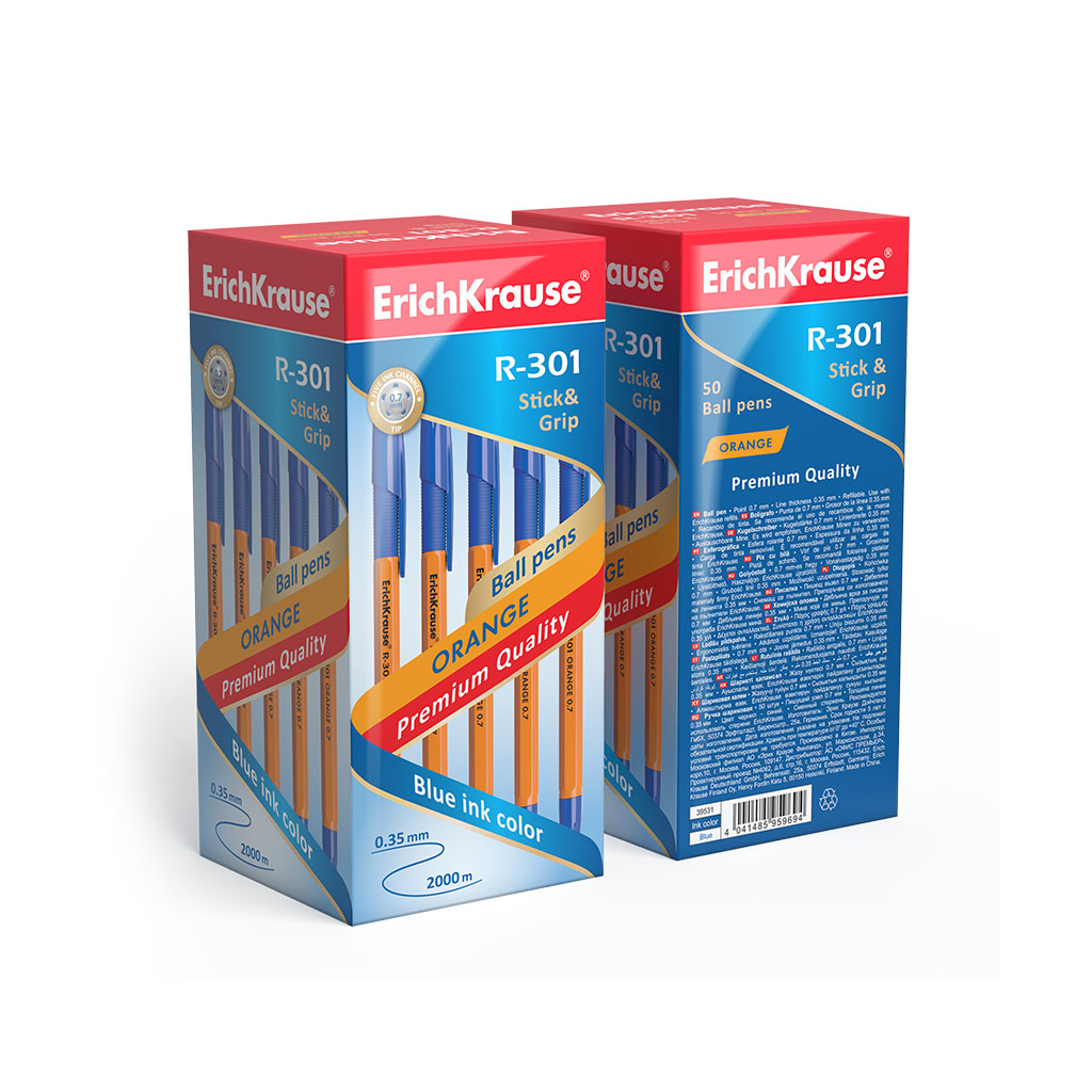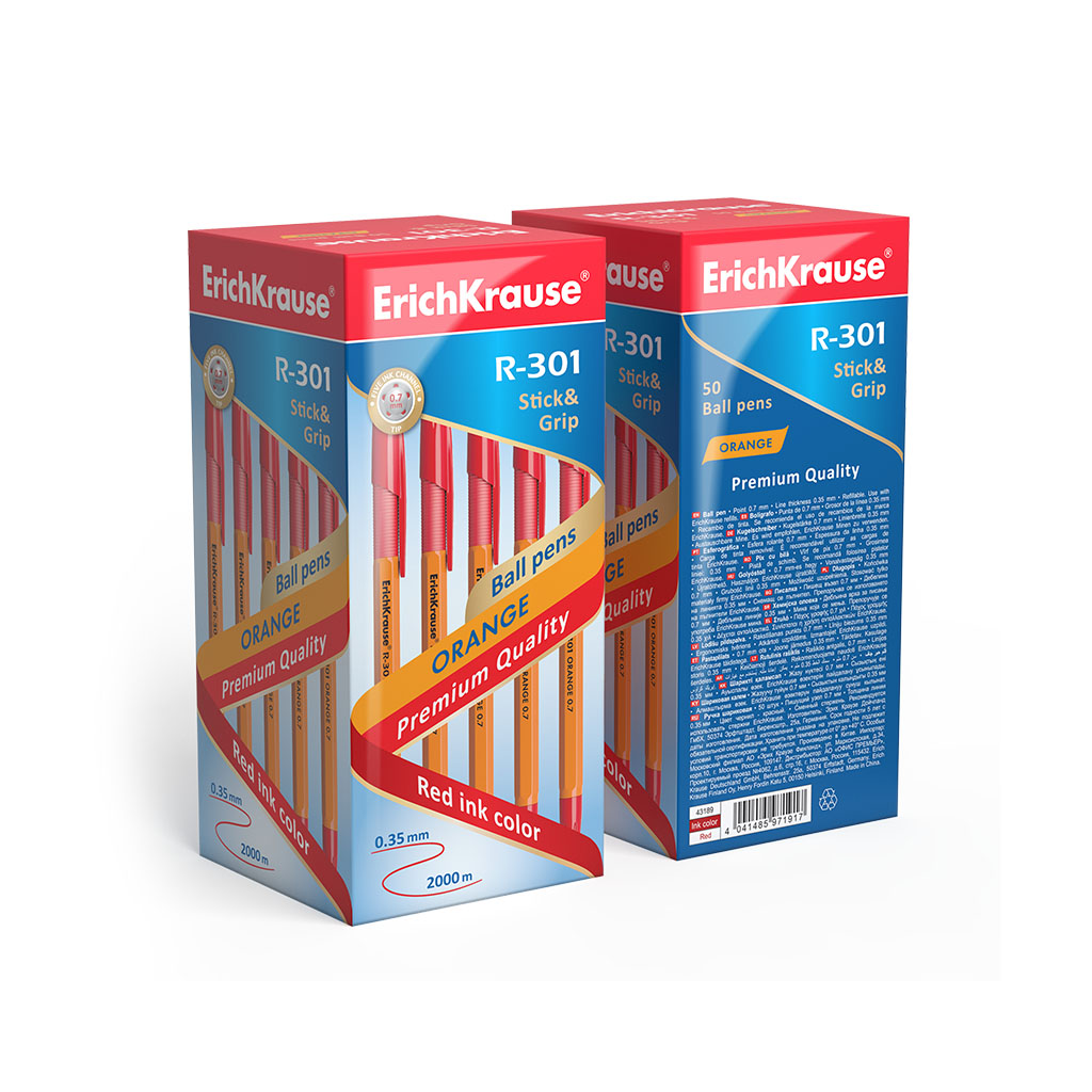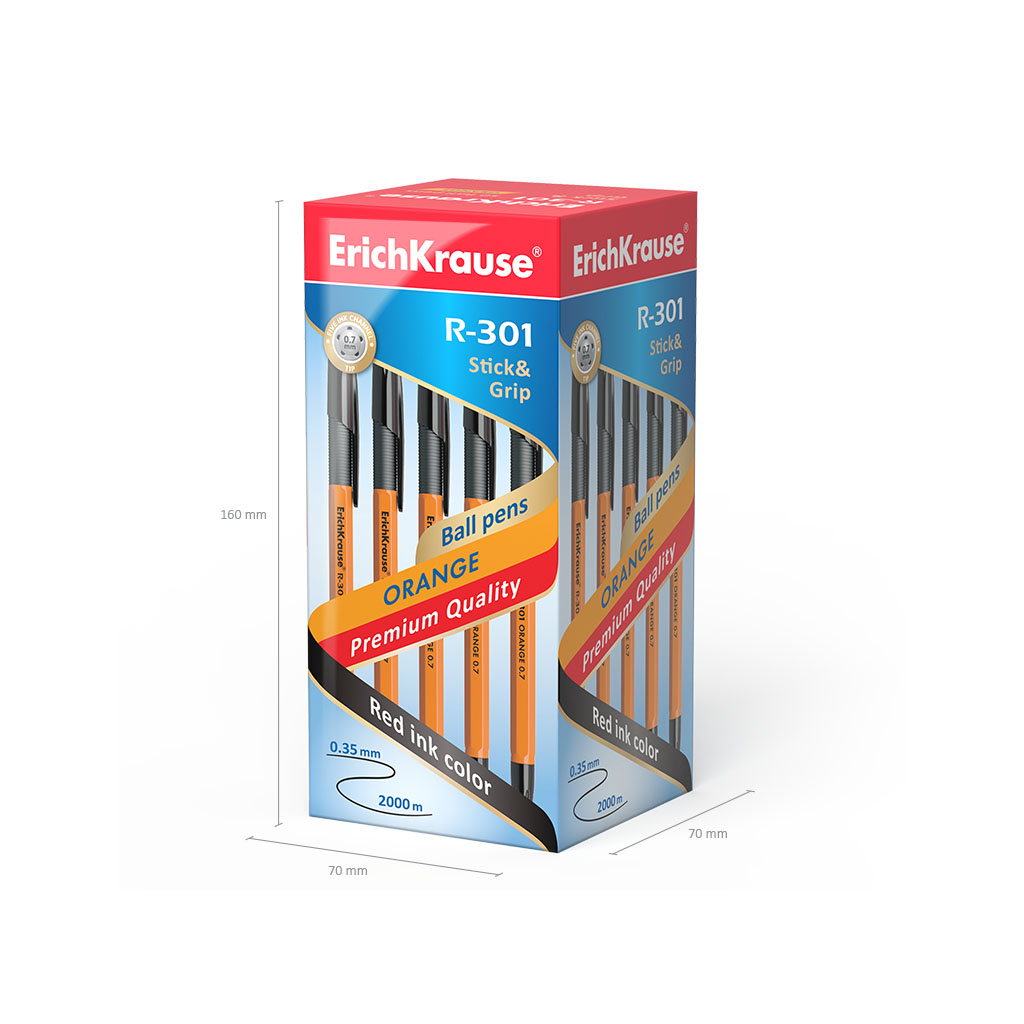 A classic Stick&Grip ballpoint pen with a standard tip type and a replaceable refill. The pen has an opaque orange hexagonal barrel with a comfortable profiled rubber grip area and a ventilated cap. The cap, the grip and the plug color match the ink color. The five-channel tip with the 0.7 mm ball diameter in combination with the quick-drying ink provides soft and quick writing. The continuous line length is 2000 m at the width of 0.35 mm, which is one of the highest rates in its category. The model R-301 Stick&Grip Orange 0.7 has a recognizable patented shape and became one of the bestselling items in the ErichKrause ballpoint pen product line-up in more than fifty countries worldwide. |