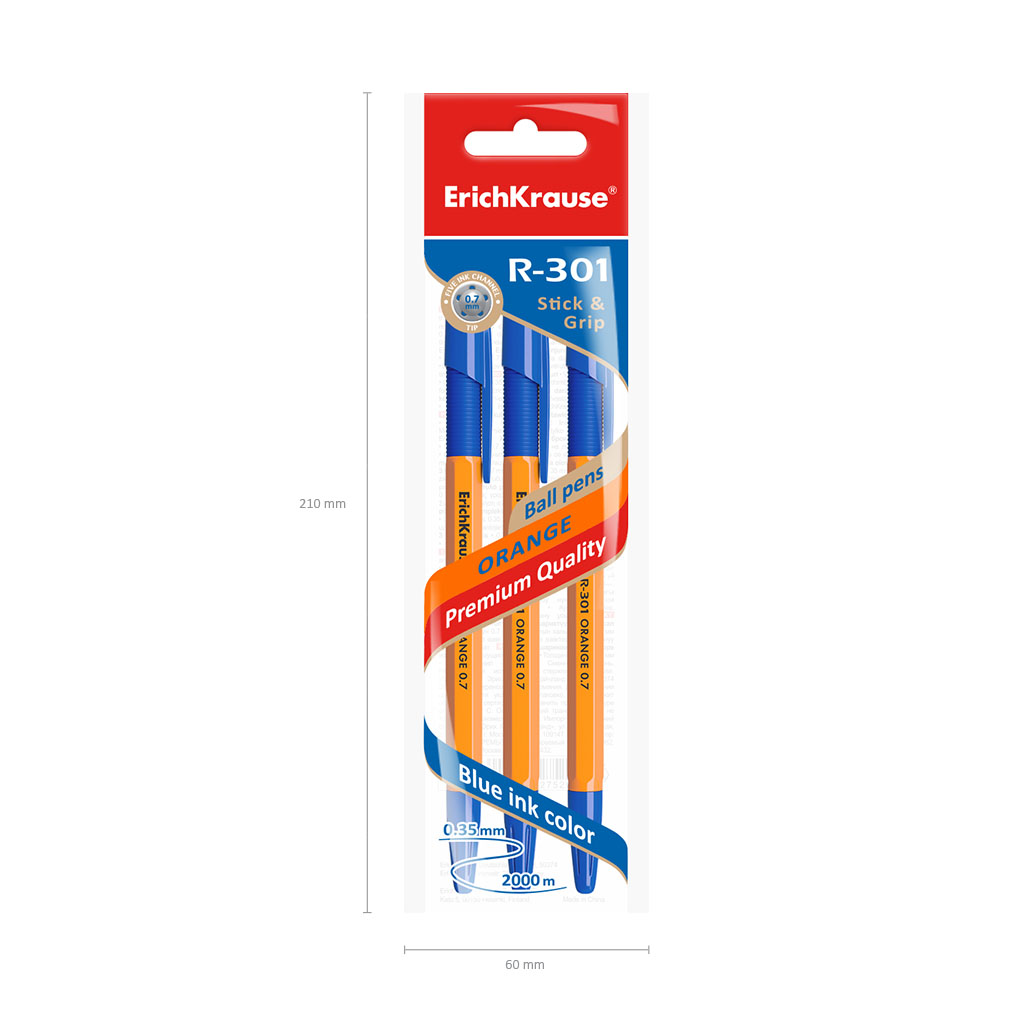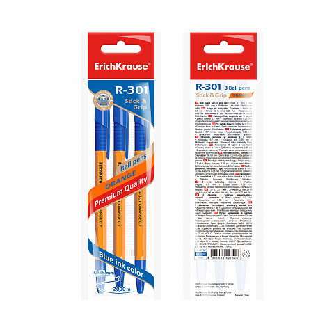 Ballpoint pen ErichKrause® R-301 Orange Stick&Grip 0.7, ink color: blue, blue, red (polybag 3 pcs.) |