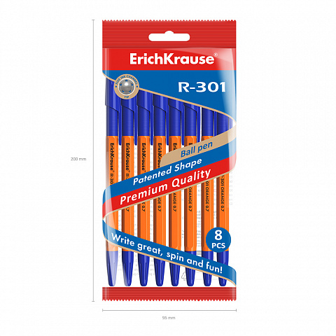 Set of 8 ballpoint pens ErichKrause R-301 Stick&Grip Orange 0.7, ink color: blue (in polybag) |