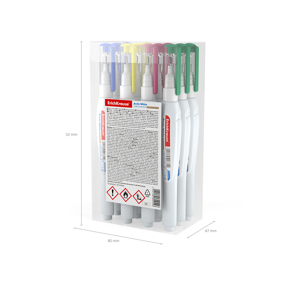 Correction pen with quick-drying correction fluid for precise corrections. Great result with ink of any type and color. High-quality metal tip provides economical consumption and smooth glide. Great for applying locally on smaller fragments. Leaves an opaque layer that won't be noticeable on photocopies. Frost-resistant. Solvent-based. Before application, shake the fluid well, so that the metallic ball inside the bottle stirs it evenly. The product shall be provided in several color/design versions (no options). |