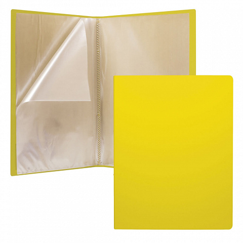 Display book A4 is made of high-quality plastic with a surface texture "sand", on which fingerprints and small scratches are not visible. Intended for storage of documents. The folder contains 20 transparent pockets, securely fastened by welding. The folder color is yellow. It holds up to 100 paper sheets. |