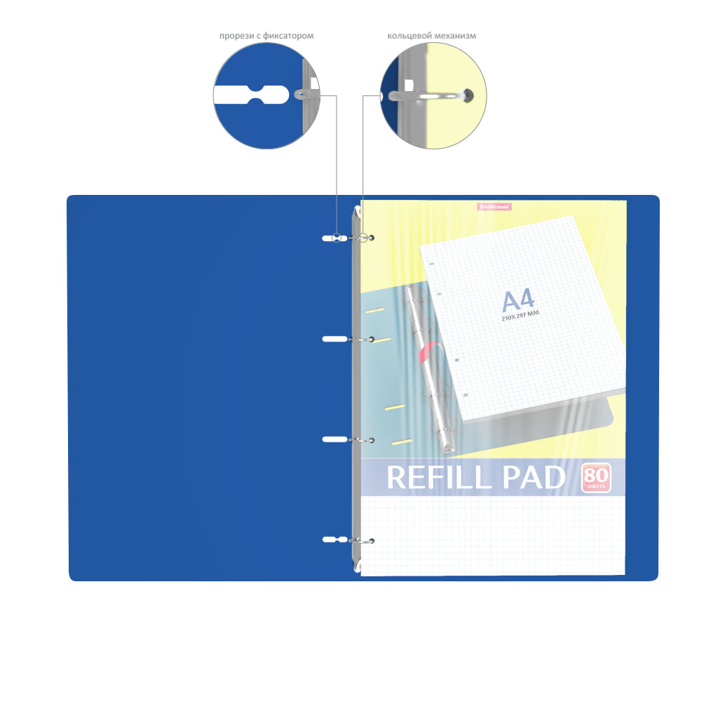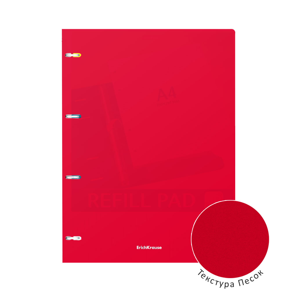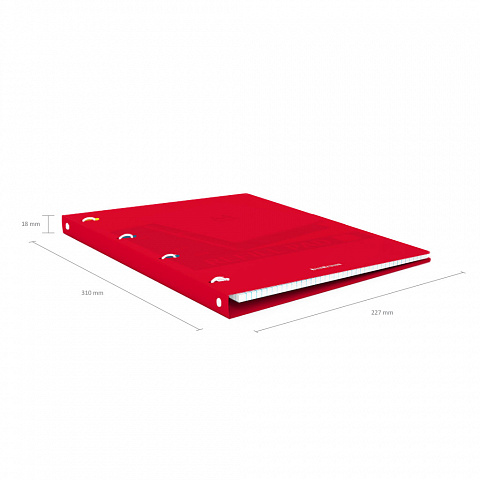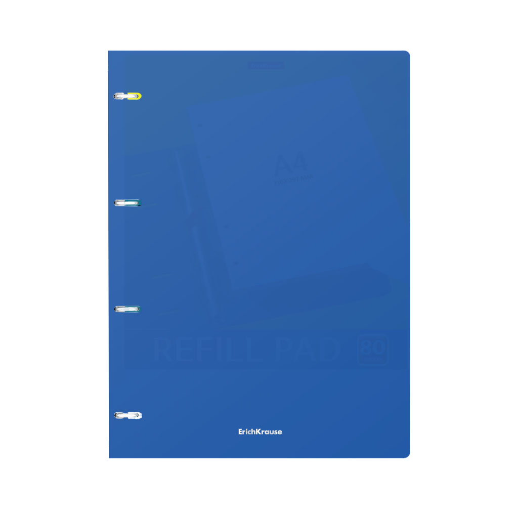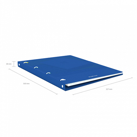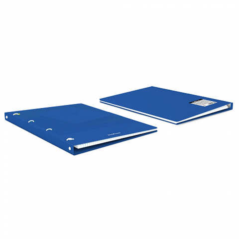 Notebook with size A4 (210x297 mm). Strong and durable matt polypropylene cover with texture «sand». 80 sheets per pad of quality paper 60 gsm. Paper ruling — dark blue squared. Cover has rounded corners for comfort and safety. Binding type — ring binders. Slots with lock for prevent unexpected notebook disclosure. |