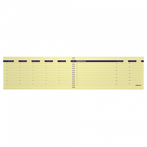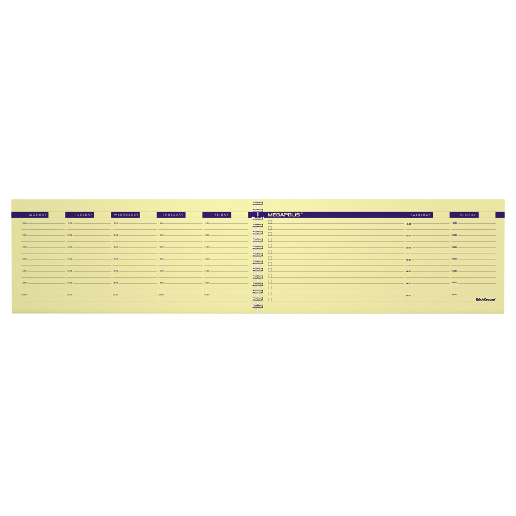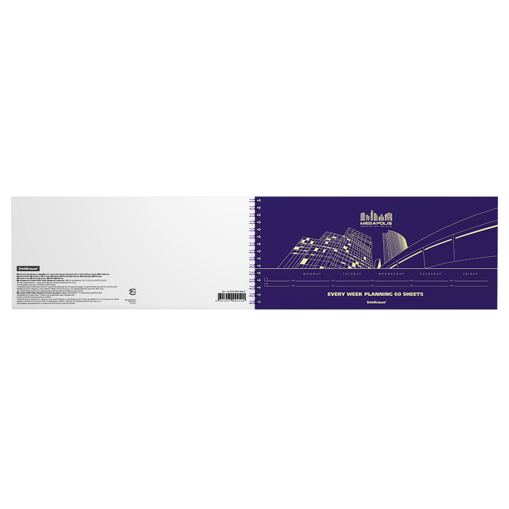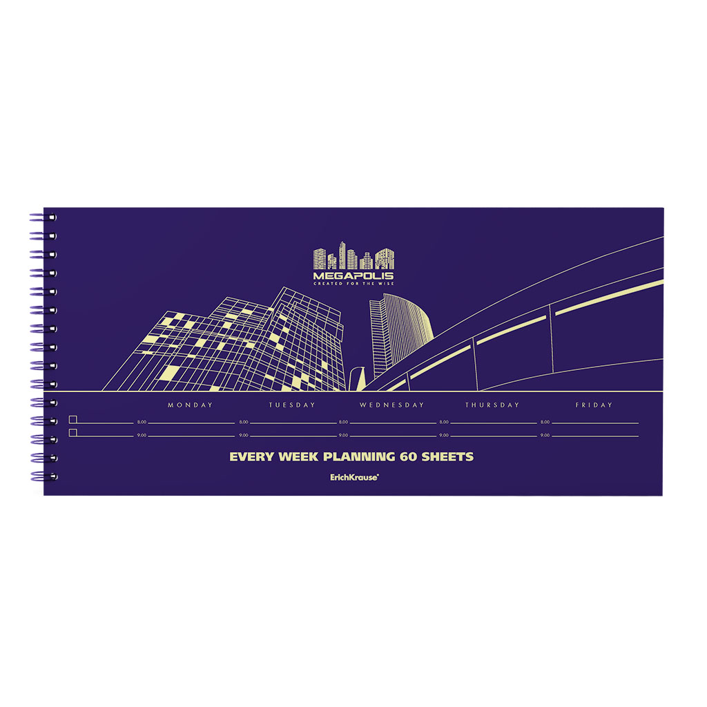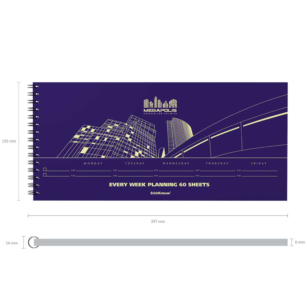 Weekly planning ErichKrause® Megapolis®. Size: 290x135 mm. Sheets: 60. Binding type - O-wire the left. Block material: yellow paper 60 g/m2. Cover material: coated cardboard 170 g/m2. Distinction: hard padding. |
