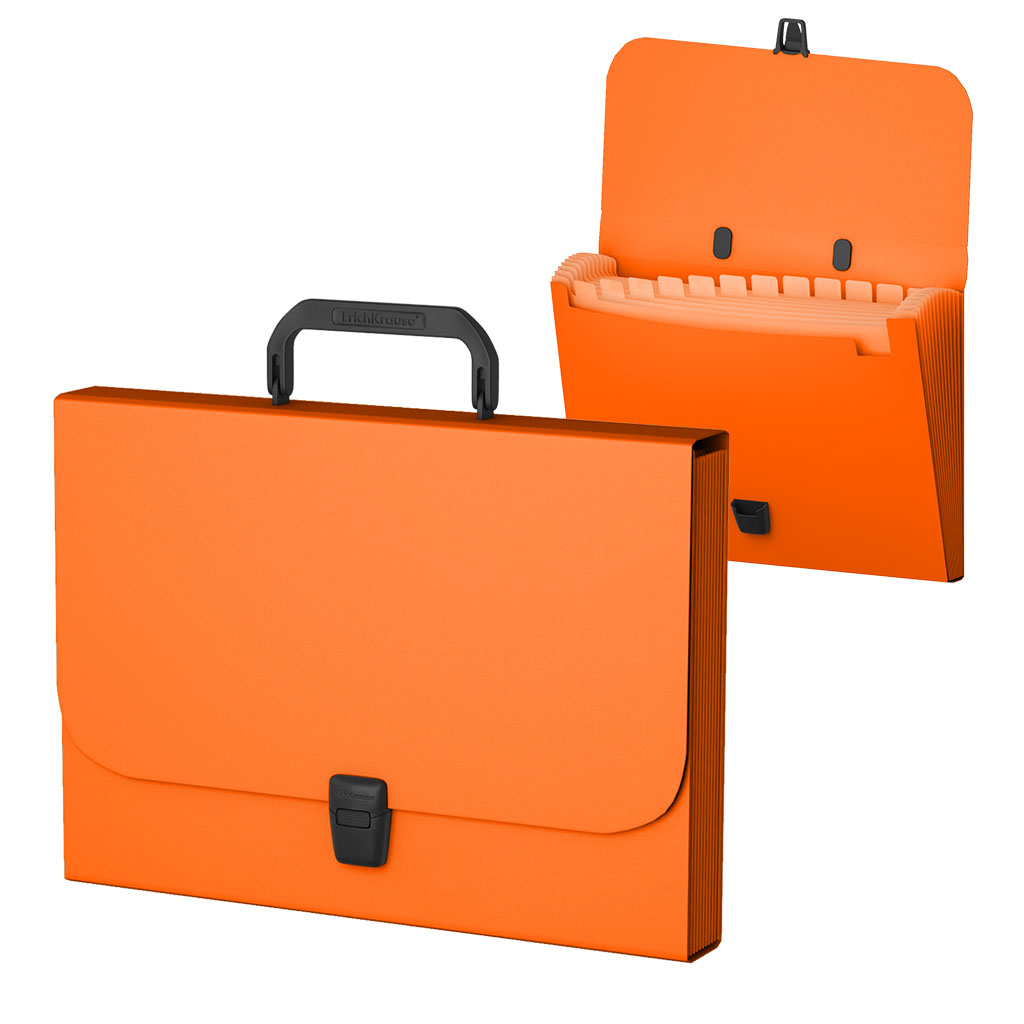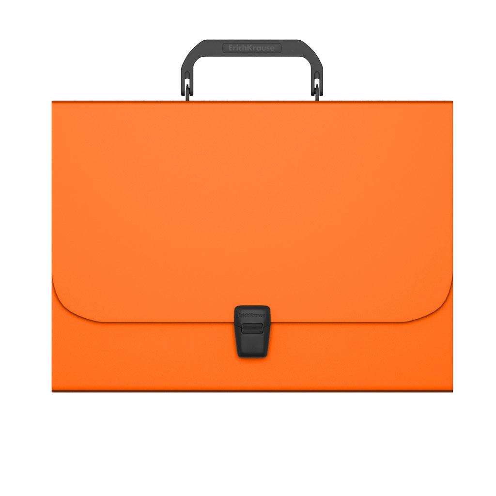 Portfolio folder A4 is made of high-quality plastic with a surface texture "sand", on which fingerprints and small scratches are not visible. Intended for transportation of documents. The portfolio folder color is orange. It holds up to 350 paper sheets. Equipped with branded lock and handle with logo ErichKrause®. Size - 335x230x35 mm, thickness - 0.7 mm. Individual barcode. |