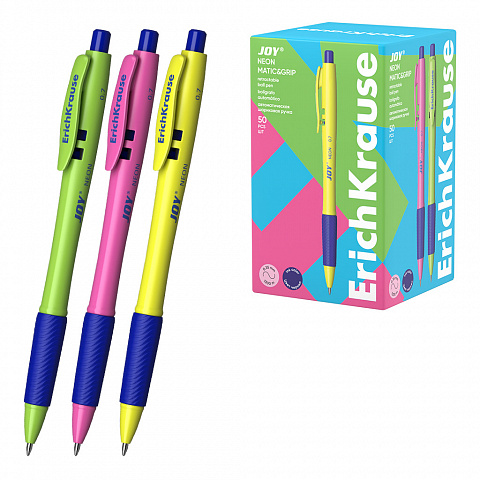 Retractable ballpoint pen ErichKrause JOY® Matic&Grip Neon 0.7, Super Glide Technology, ink color: blue (box 50 pcs.) |