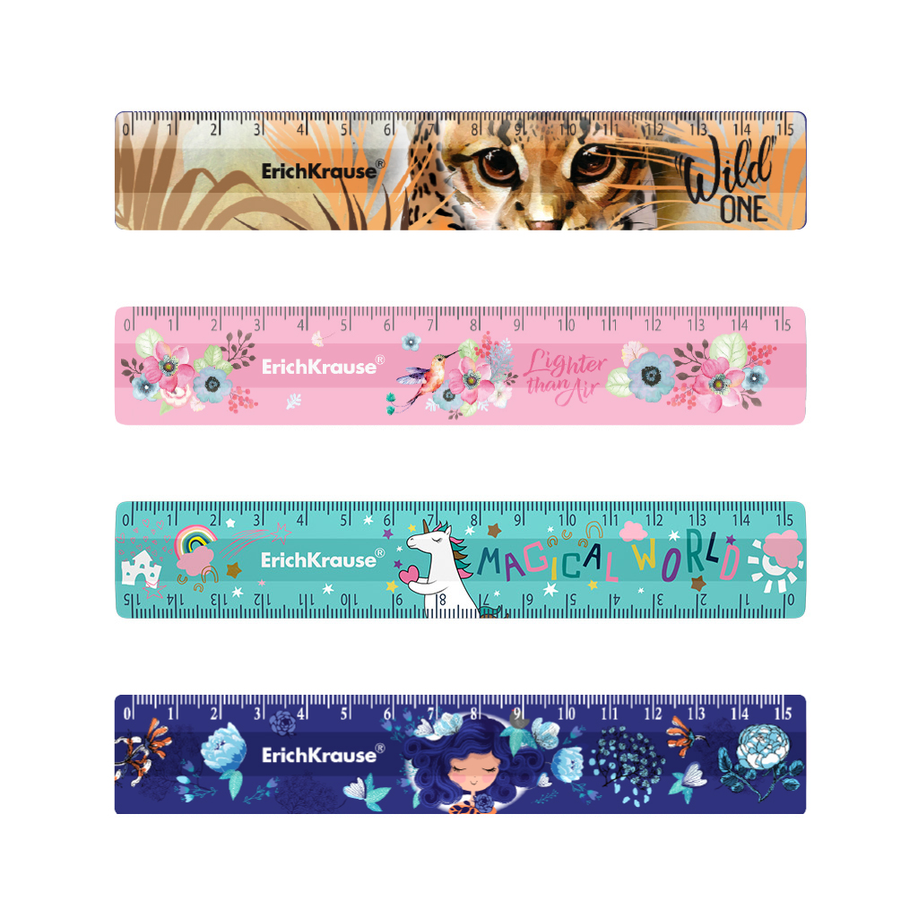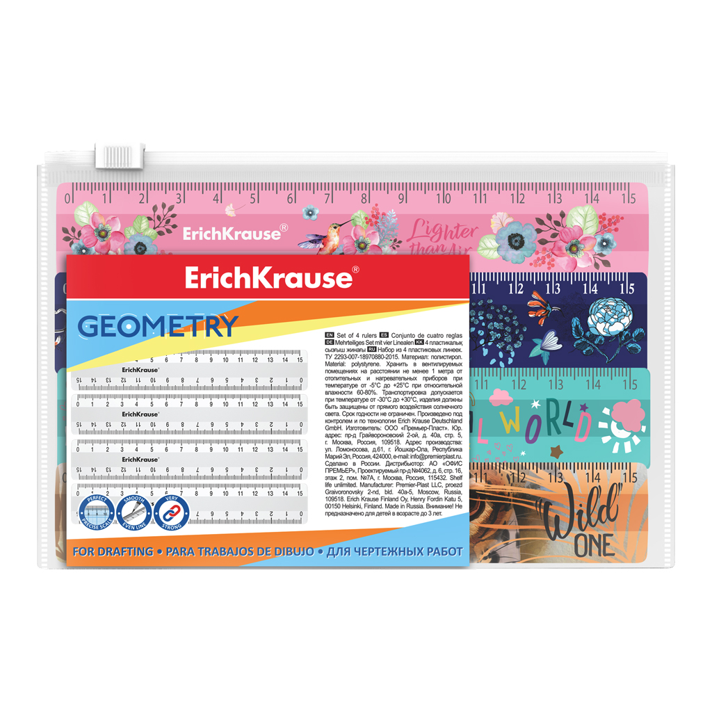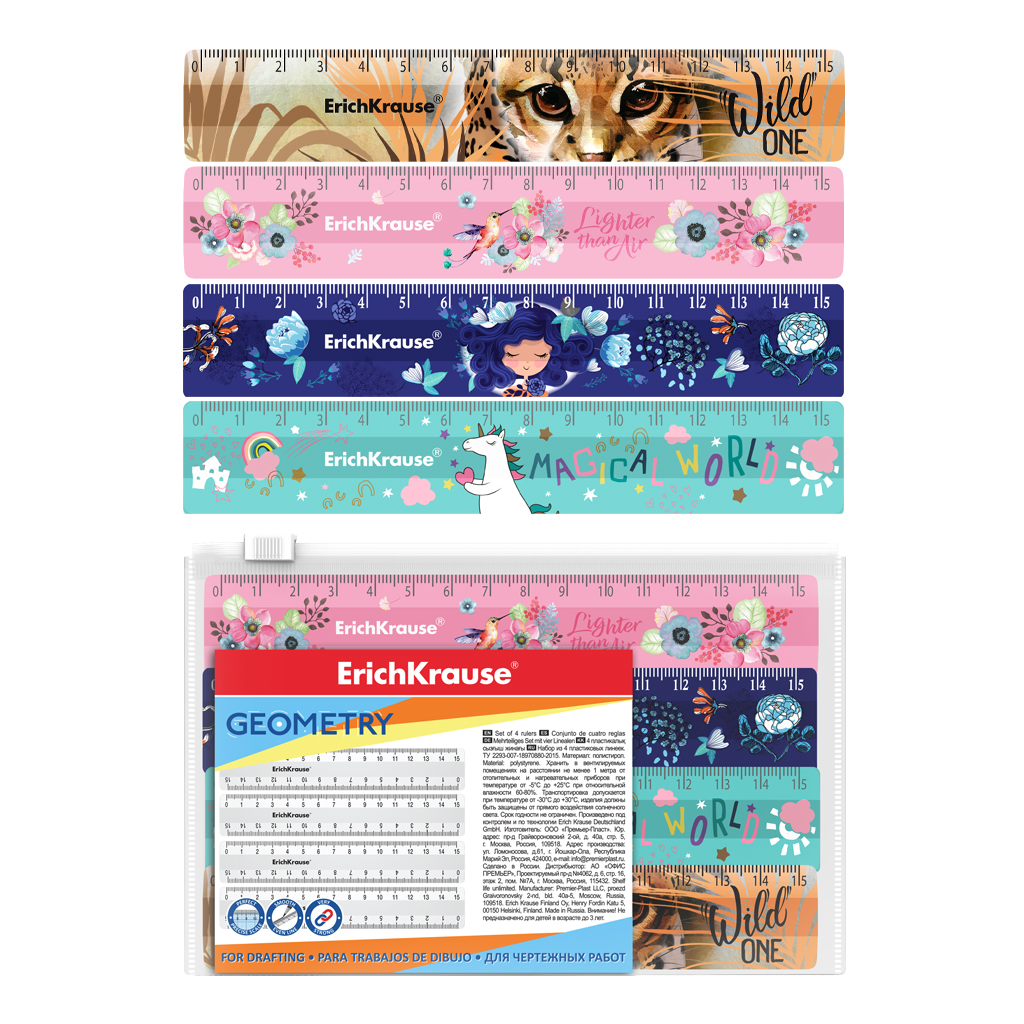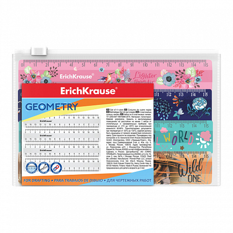 Set of 4 plastic rulers ErichKrause®, 15cm, assorted, in zip pocket (girl) |