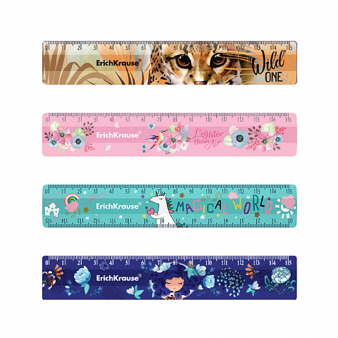 Transparent ruler made of high-quality plastic. The double-sided scale and the drawing are applied to the thermal film. The length of the marking is 15cm. Assorted: Colibri, Bluecurl, Rainbow Skate, Wild Cat. |