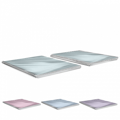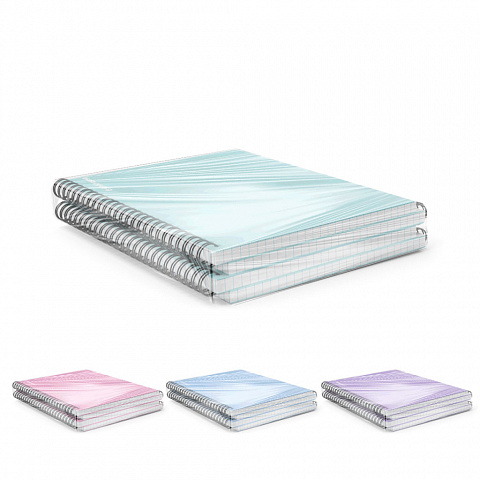 Notebook with size A5 (148x210 mm). Strong and durable matt polypropylene cover with texture «sand». 80 sheets per pad of quality paper 60 gsm. Paper ruling — dark blue squared. Cover has rounded corners for comfort and safety. Binding type — wirebound. 4 pieces of one color in shrink wrap. Available in assorted colors with no choice. |