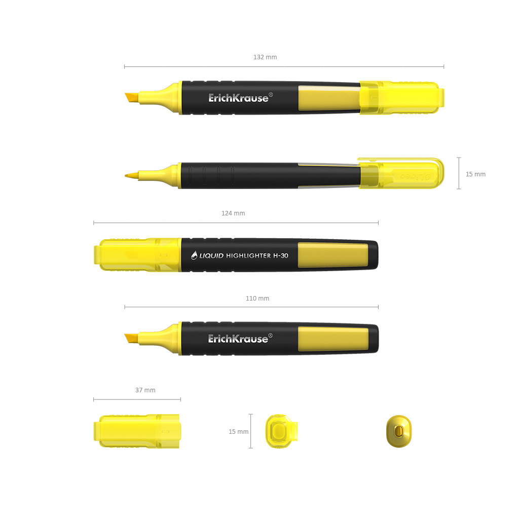 A highlighter with liquid ink has enlarged ink capacity due to the Free ink technology. A highlighter for marking text on all paper types including fax and copying papers. The highlighter has a flattened barrel with a soft rubber coating, translucent cap and a transparent ink level window. The chisel-shaped tip allows to vary the writing width. The wide part of the tip (3.0 mm) is convenient for highlighting text, and the thin part (1.0 mm) is for underlining. The color of the cap and the front body part match the ink color. The fluorescent water-based ink dries quickly after emission and does not leave marks on the back of the paper thanks to thin, even drawing. The shelf life is 5 years. Maximum writing length is 500 м. |