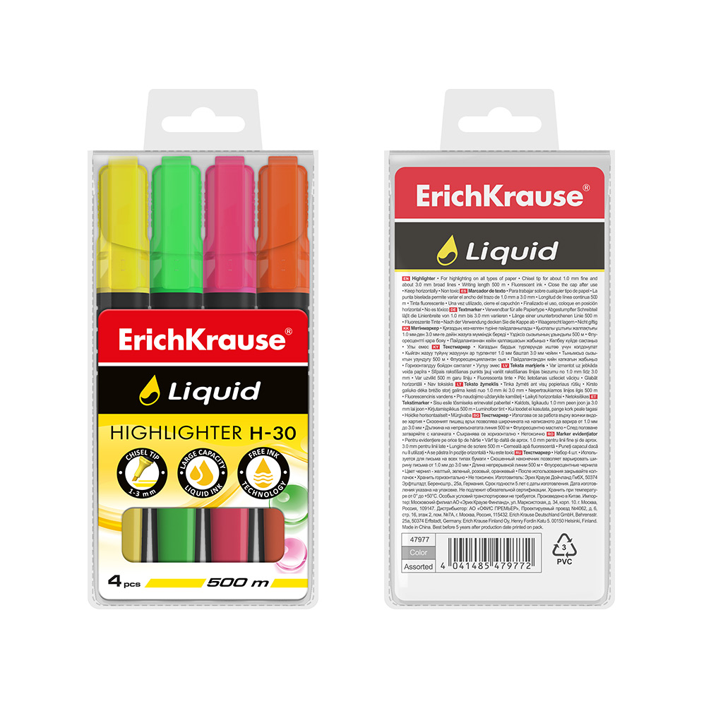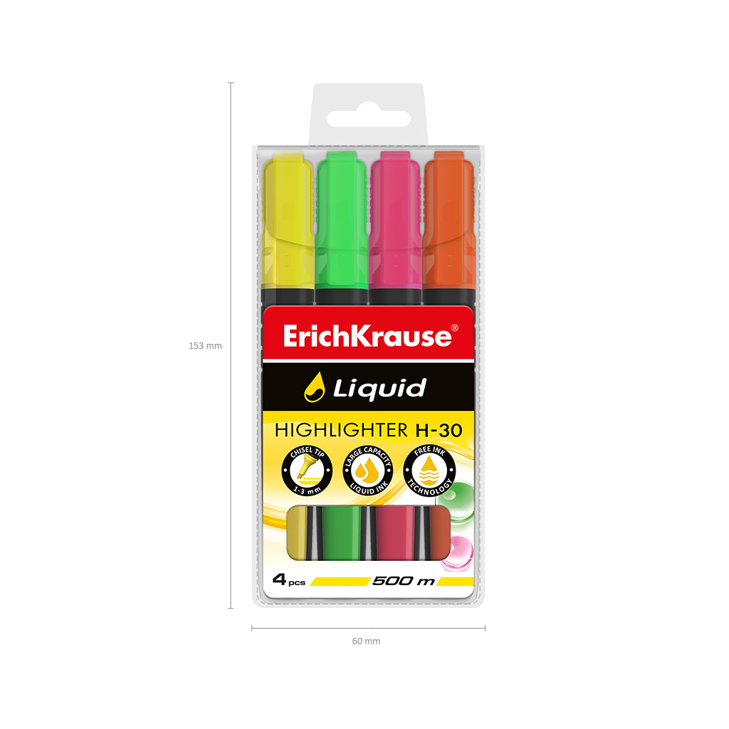 Highlighter ErichKrause® Liquid H-30, color: yellow, green, pink, orange (pouch 4 pcs.) |