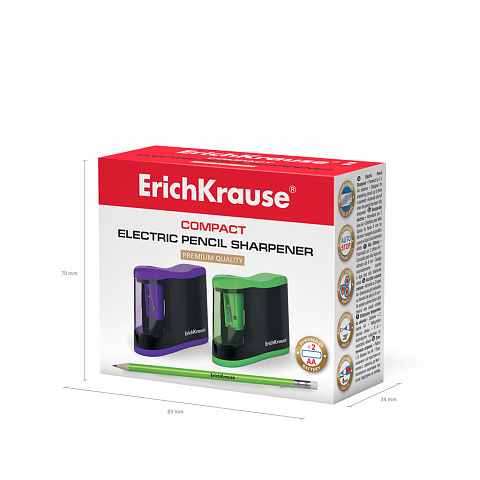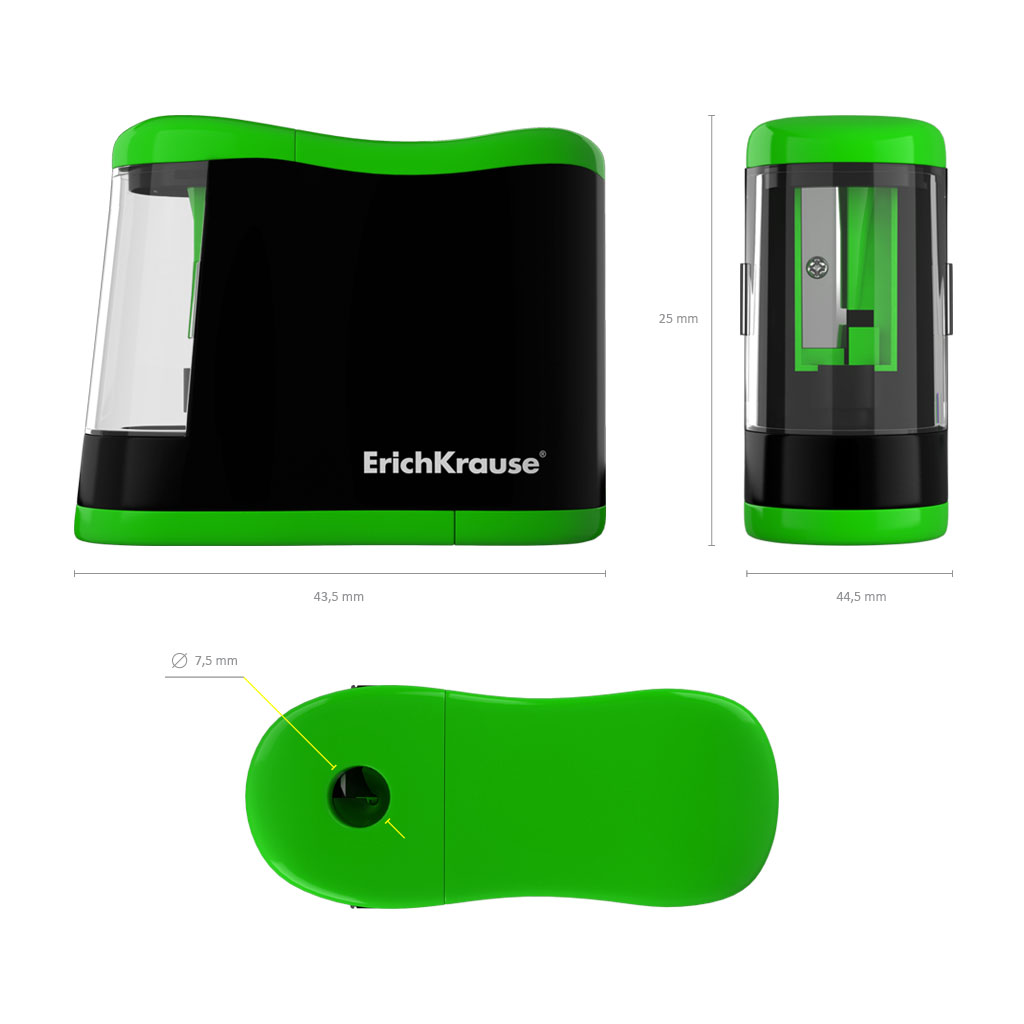 Sacapuntas electrico con el contenedor para las virutas. Apagado automatico cuando el lapiz esta totalmente afilado. Alimentado por 2 pilas AA. Sacapuntas con un orificio de 8 mm de diametro para afilar lapices estandares de grafito negro y de color. Cuchilla niquelada de acero al carbono de alta calidad.