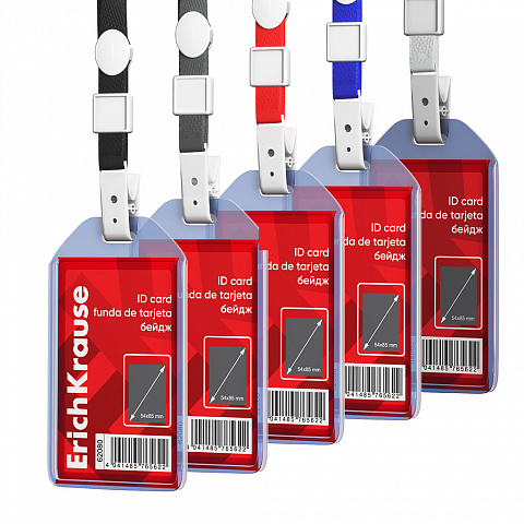 Бейдж вертикальный в комплекте с лентой ErichKrause размер вставки 54х85 мм, прозрачный, цвет ленты ассорти, в пакете |