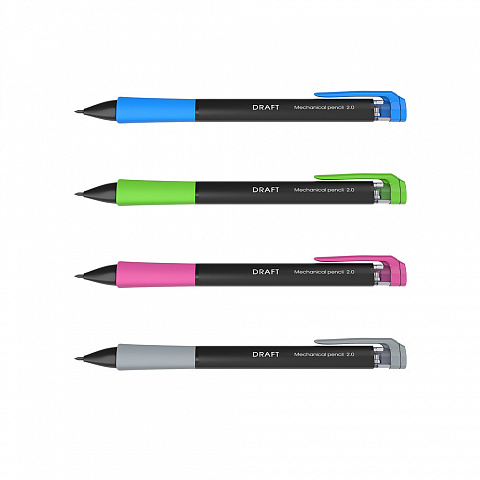Механический карандаш эргономичной треугольной формы с удобной профилированной зоной хвата из резины. Оснащен точилкой. Твердость ТМ. Диаметр грифеля – 2.0 мм. |