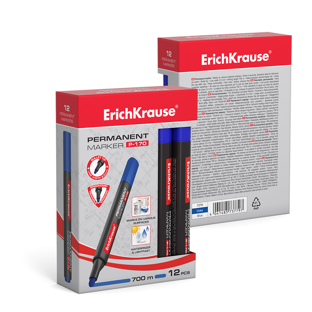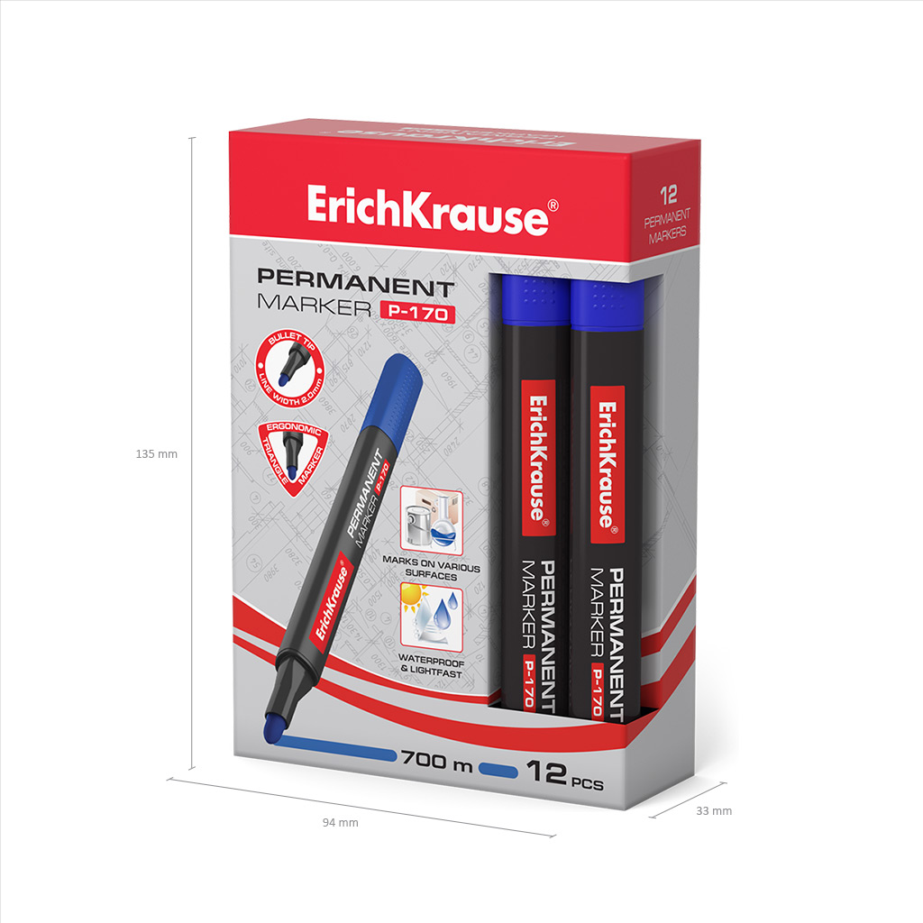 Перманентный маркер ErichKrause P-170, цвет чернил синий (в коробке по 12 шт.) |